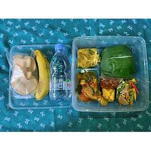 Nasi Paket B ( Nasi, Daging Lapis Cabai, Telur Balado, Orek Tempe, Capcay, Sambal, Pisang Kerpuk dan Air Mineral )
